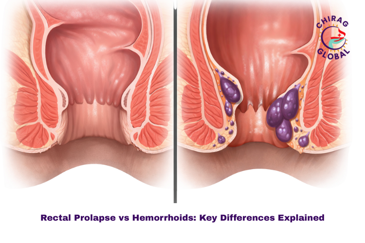 Rectal prolapse usually appears as a larger circular bulge and may come out during bowel movements. A specialist examination at Chirag Global Hospitals in Bangalore can confirm the diagnosis.